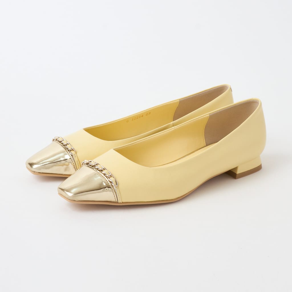 まろやかなイエローが春らしいパンプスは、トゥ部分のメタリックゴールドや革通しチェーンが華やか! 柔らかい色使いを軸にしたスカートスタイルなど、優しげフェミニンな着こなしにぴったり。
