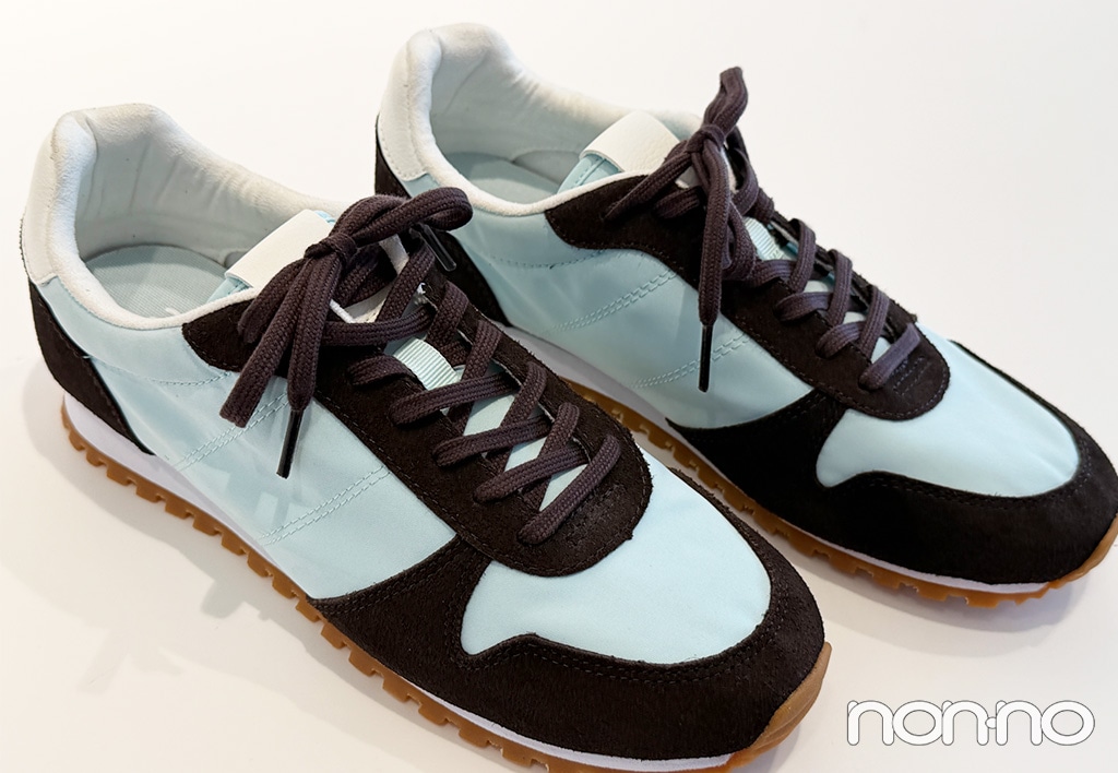 今回のコレクションで編集部がときめいたのがこちらのスニーカー! ミントブルーとブラウンを合わせたチョコミントのような配色に目を奪われました♡ 春になるとやっぱり気になるパステルカラーは小物で取り入れるのが簡単。爽やかなミントブルーと落ち着いたダークブラウンの組み合わせなら、甘さ控えめにしたい大人の着こなしに取り入れやすいです。春定番のブルーデニムとだって相性最高、寒色系カラーのアイテムと組み合わせることでコーデに統一感を出せます。白のボリュームスカートなどで甘カジュアルに着こなすのも絶対に可愛い! 淡色コーデに足元のブラウンが印象をほどよく引き締めてくれそうです。