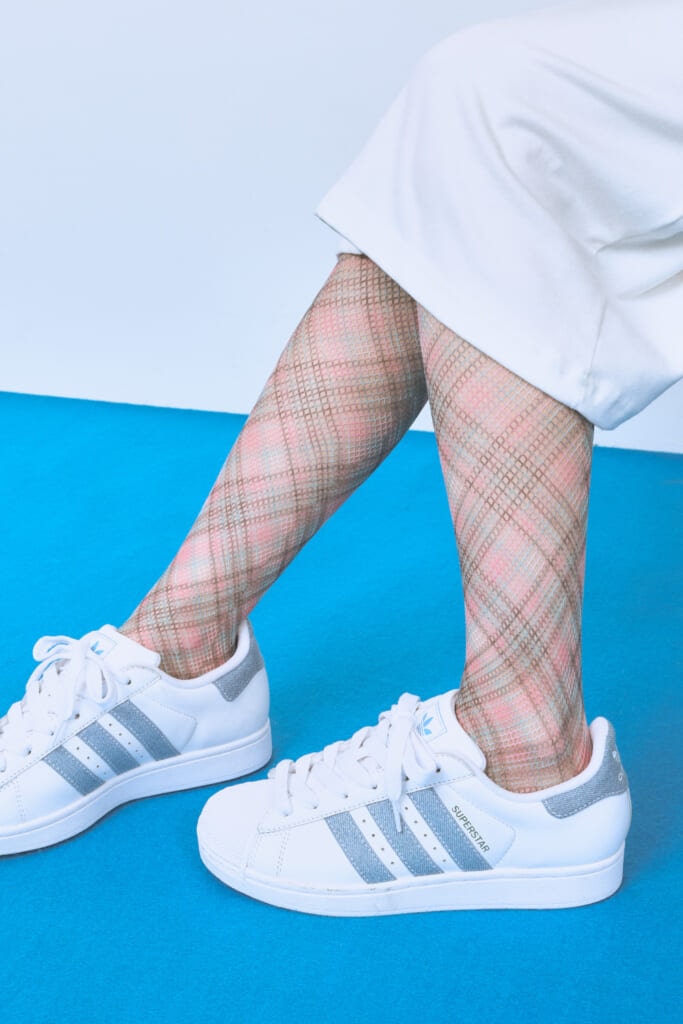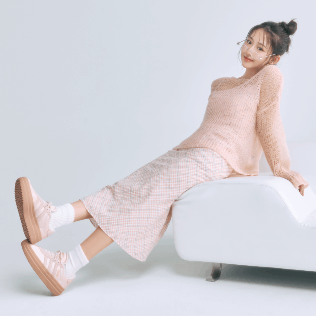 ピンクのスリーストライプスと薄底シルエットで、デニムに今っぽい甘さを添えるカジュアルフェミニン。