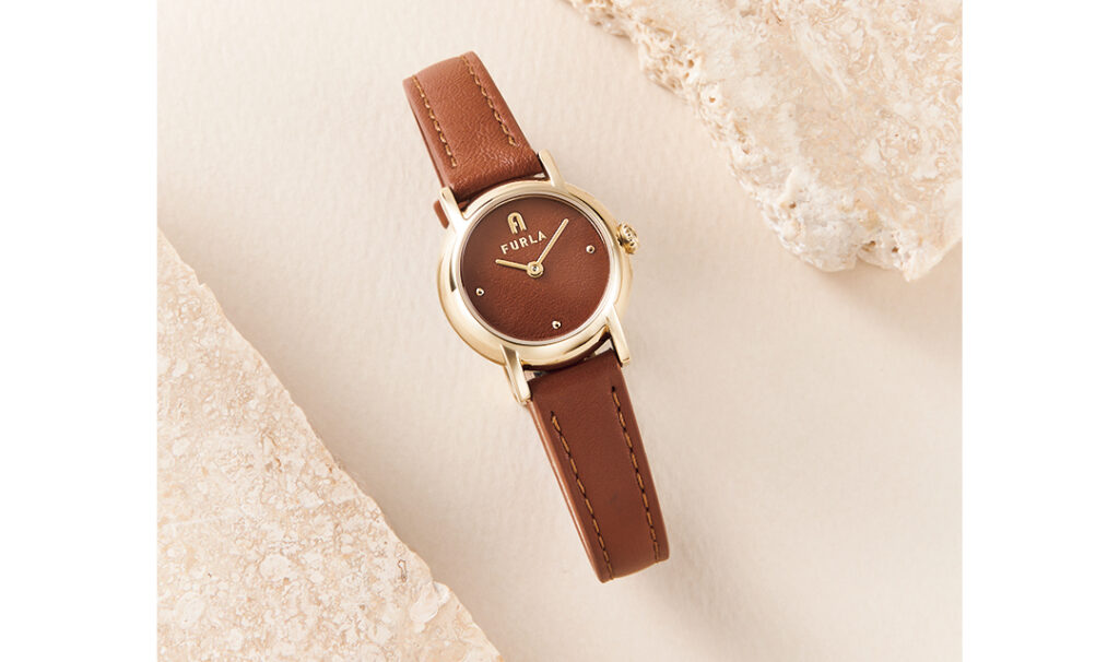 マットで柔らかなブラウンレザーベルトにミニマルなゴールドフェイスが特徴。つける人を優しげな印象に導いてくれる。