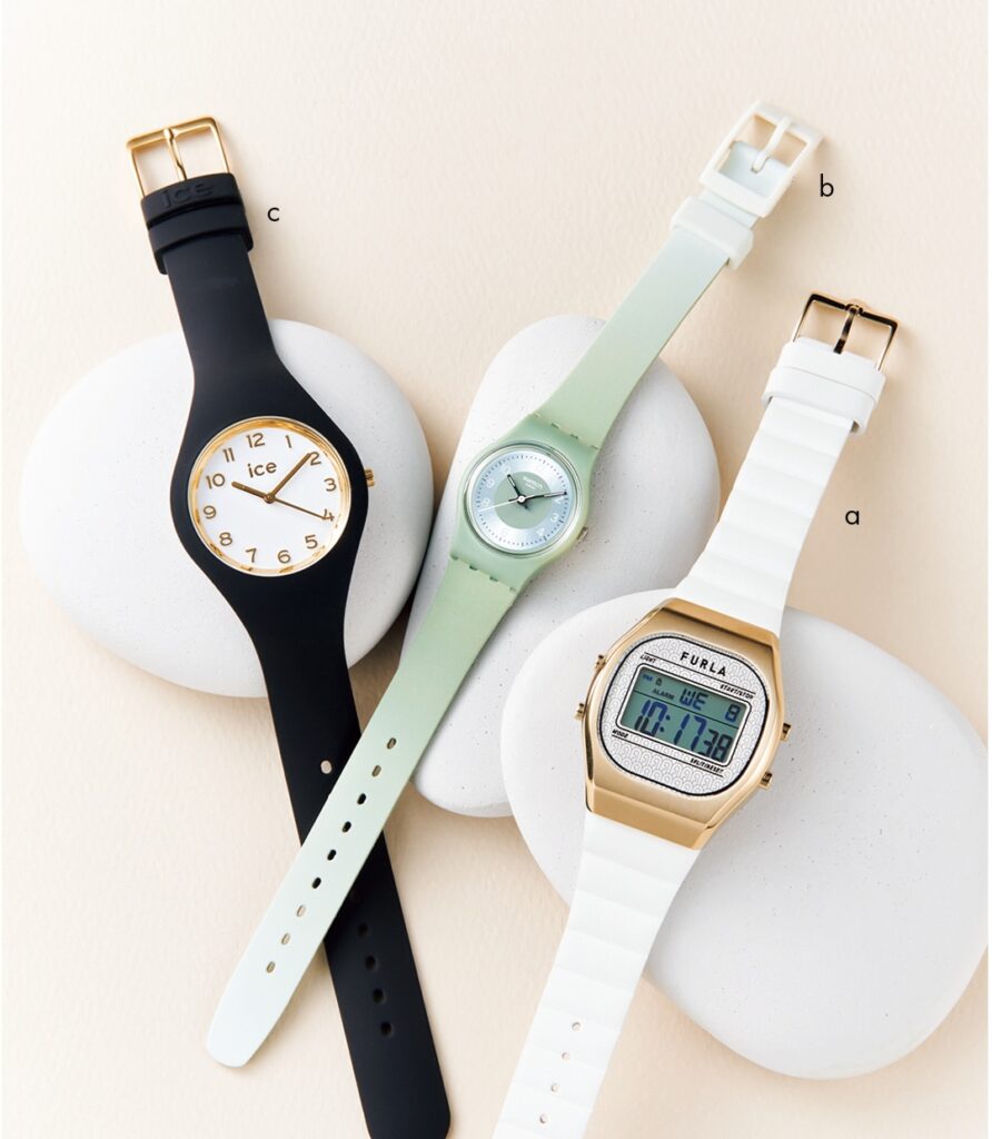 b爽やかなブルーのフェイス×シルバーベルトが知的さと好感度を兼備。