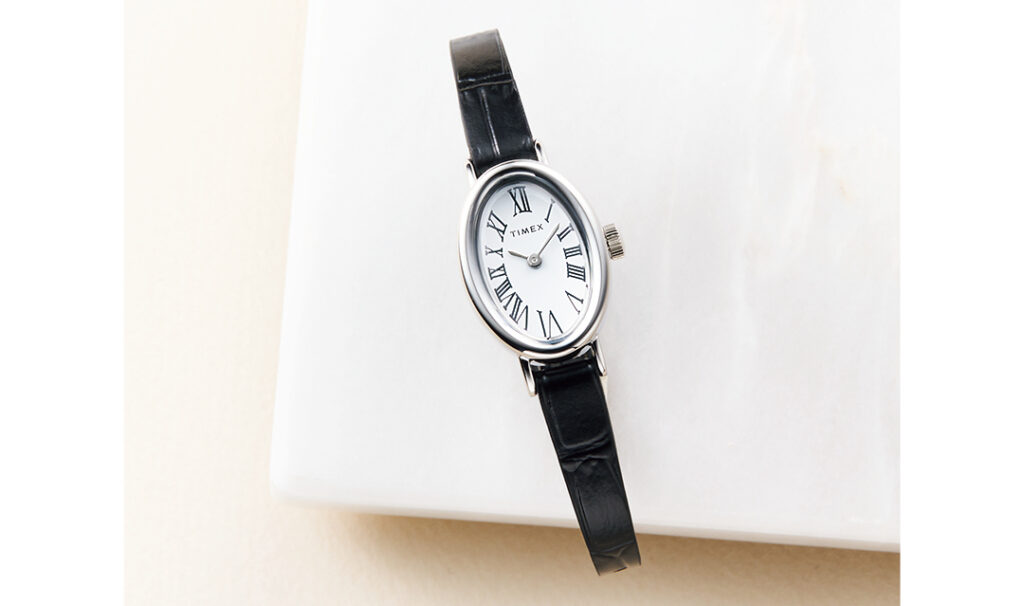 楕円形の小さめケースやローマ数字のインデックスがエレガント。ガラス面のふっくらとしたドーム型も女性らしさを後押し。