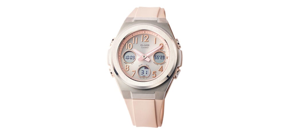 ストップウォッチやアラーム、10気圧防水などタフな機能を備えながらほんのりピンク×シルバーカラーで新社会人のフレッシュさにマッチ。