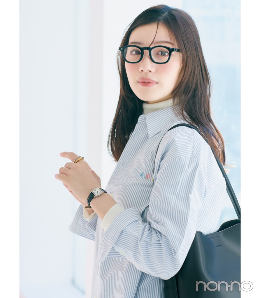 時計¥28600/ピークス(ロゼモン) シャツ¥30800/アー・ペー・セー カスタマーサービス(アー・ペー・セー) ニット¥2990/UNIQLO メガネ¥46200/アイヴァン 東京ギャラリー(アイヴァン) リング¥2800/CENE バッグ¥48400/ロー ソウル