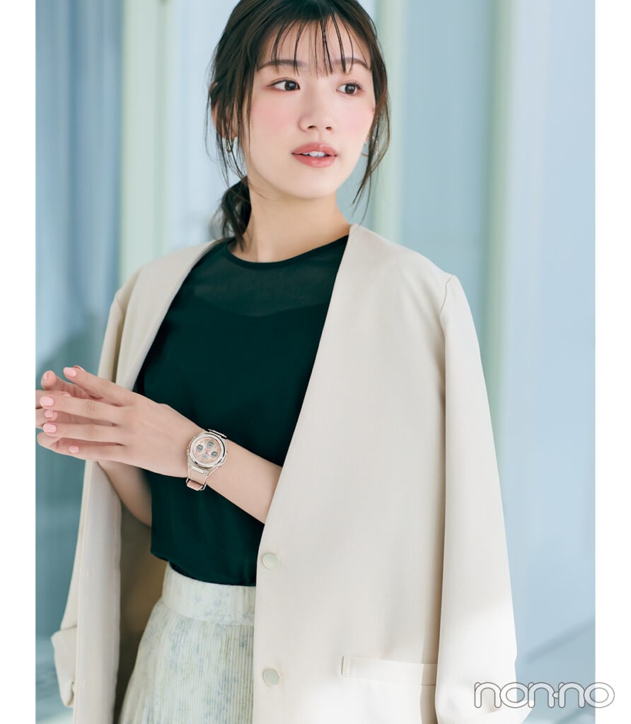時計¥99000/シチズンお客様時計相談室(シチズン クロスシー) ジャケット¥19800/ココ ディール ブラウス¥6930/アンティローザ(FEKETE)