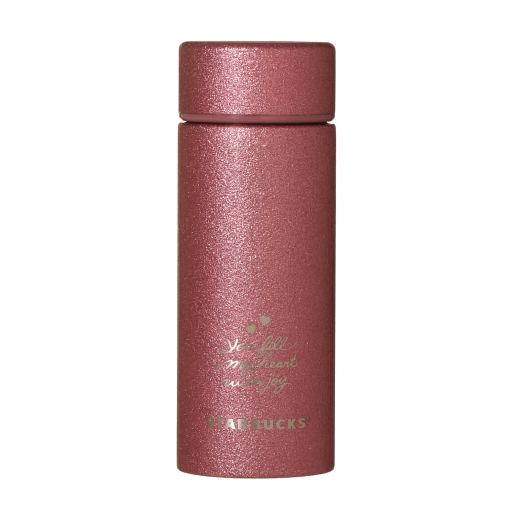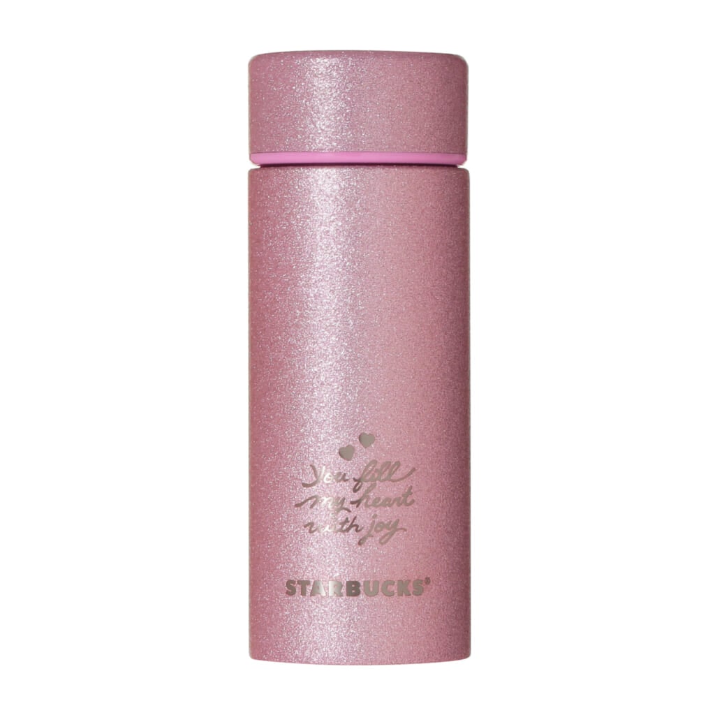 ピンクのグリッターできらめくステンレスボトル。表にはSTARBUCKSのワードロゴ、手書き風メッセージがレーザー加工で表現されています。真空⼆重構造ステンレスで、保温・保冷性に優れています。