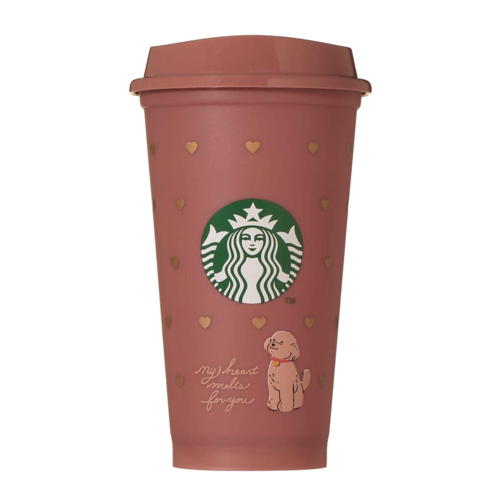 ハート柄に犬をワンポイントデザインしたリユーザカップも。温かい飲み物を入れると赤みブラウンからオフホワイトに色が変化するという面白い仕掛け。