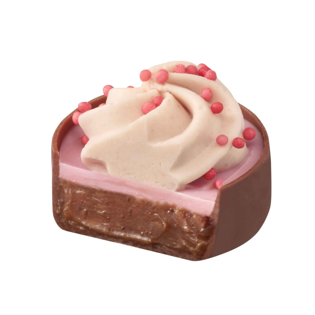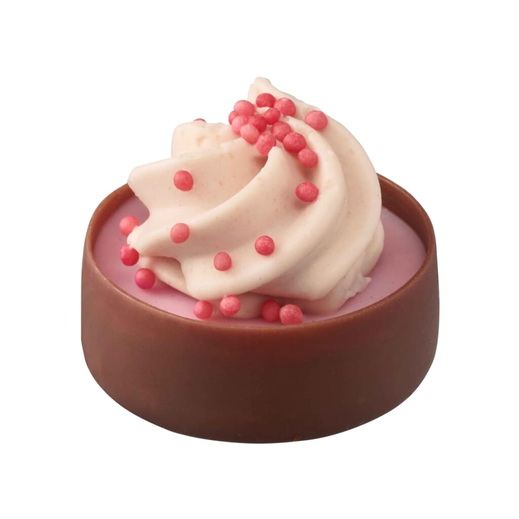 ストロベリーのコンフィチュールとムースをミルクチョコレートのカップで包まれています。ピンク色のクリームに赤いチップをちりばめて、まるでティーパーティを彩るスイーツのようなひと粒。