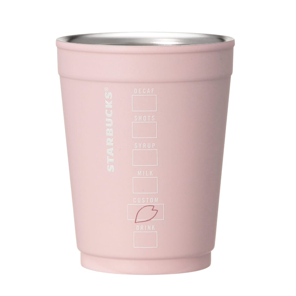 直接ドリンクを注いで使うほか、テイクアウトカップごと入れることでカップホルダーとしても使用できる2WAYステンレスカップ。スターバックスのトールサイズのプラスチックカップに合うように設計されています。カップホルダーとして使う場合、真空⼆重構造の断熱効果で、より長い時間フラペチーノや冷たいお飲み物を結露を防止して楽しめます。桜を思わせる淡いピンクで、背面のカスタマイズボックス部分にはさりげなく桜の花びら