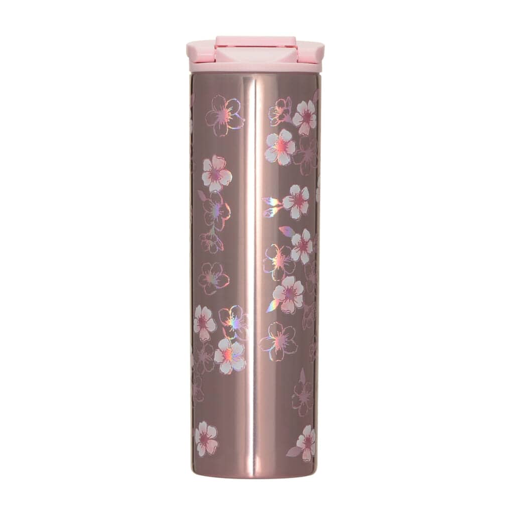 リッドにロック機能がある、スターバックスらしいカップ形状のステンレスボトルに桜バージョンが登場。上品なピンクベージュのボディに、繊細なタッチで描かれた桜が華やかなデザインです。底面のゴールド部分もリッチな印象。真空⼆重構造ステンレスで、保温・保冷性に優れています。