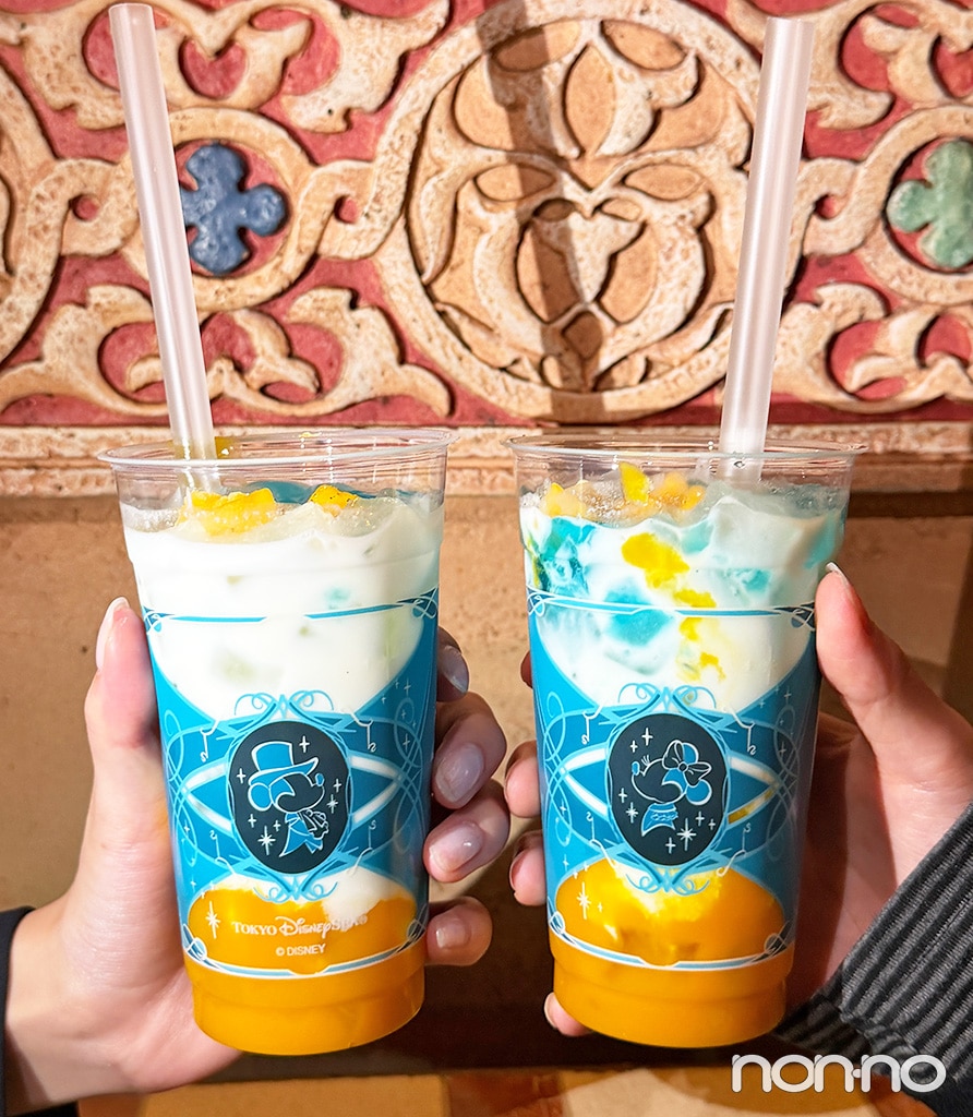 25周年の衣装に身を包んだミッキーマウスとミニーマウスのシルエットが描かれたグラスをお土産に持ち帰ることができる3つのドリンクをご紹介。