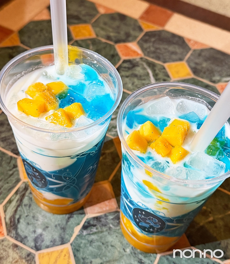 トップにシルバーのラメがのっているよ! 混ぜていくとブルーのドリンクに、ラメがキラキラと散らばっていて輝く海みたい♡ こういうちょっとしたサプライズ、さすがディズニーさまです!