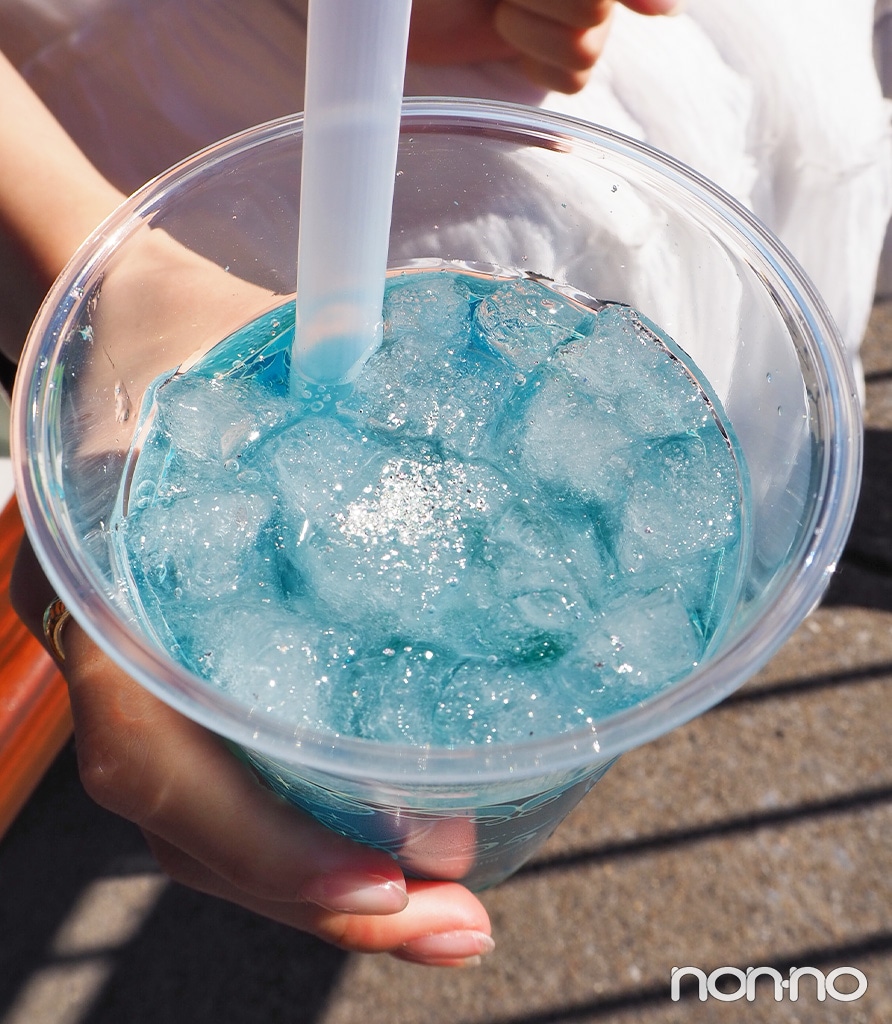 ブルーの見た目が、まさにジュビリーブルーなドリンクは手持ち写真も映えること間違いなし! ドリンクの正体はキュッと甘酸っぱいレモネードで、暑くなってくるこれからの季節にぴったり。