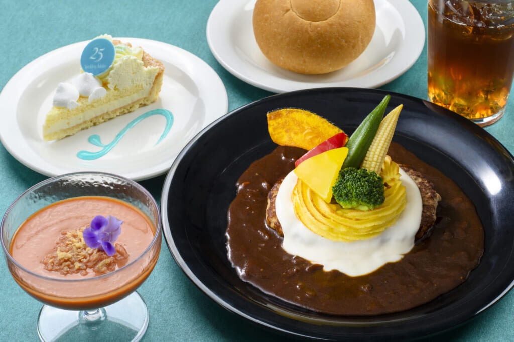 「ホライズンベイ・レストラン」ではマッシュドポテトと野菜をブーケのようにのせた華やかなハンバーグがメインのセットを用意。トマトといちごの冷製スープや、パンまたはライス、青いレモン風味のソースを添えたレアチーズタルト付きで大満足なセットはランチにもディナーにもうってつけ。プライオリティ・シーティング対象のお店なので、予約をお忘れなく!