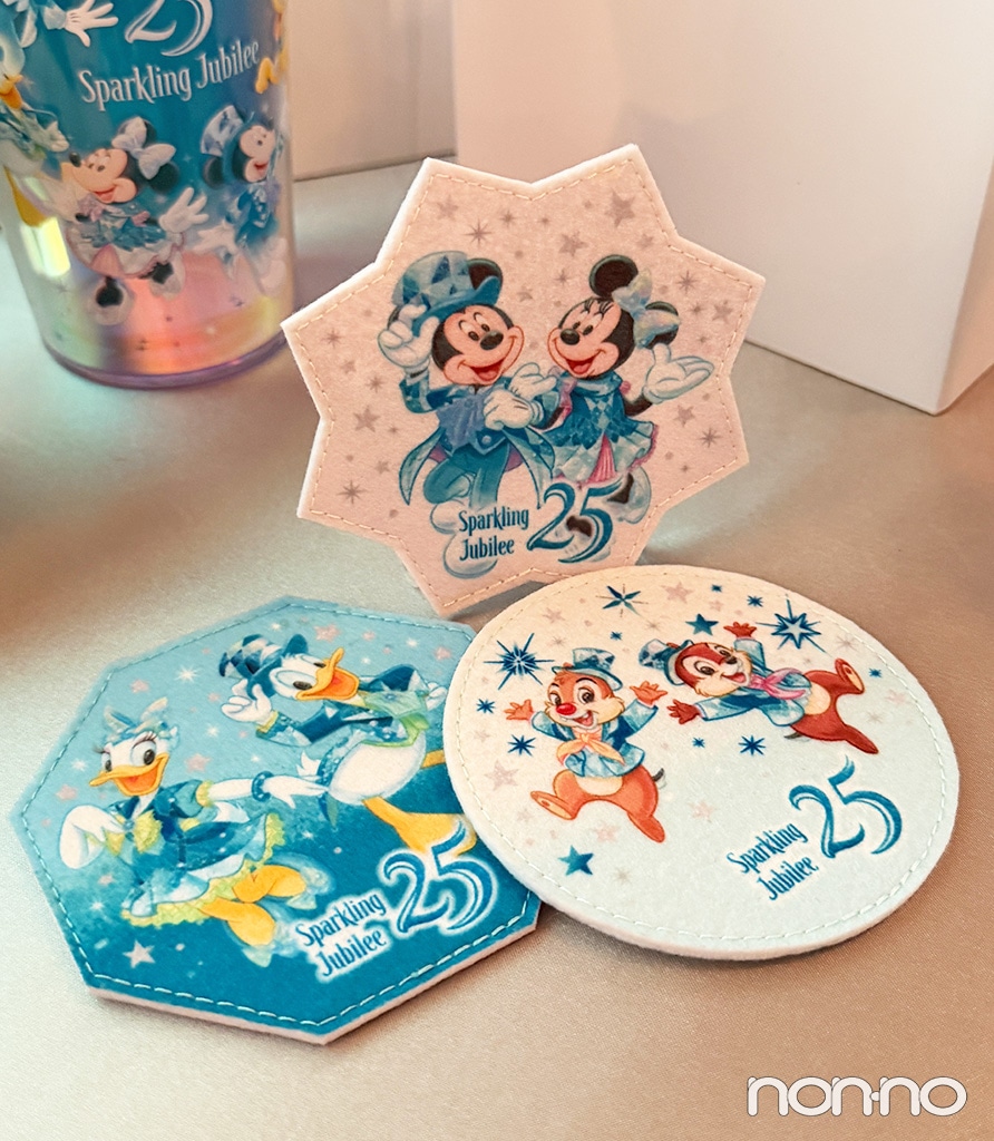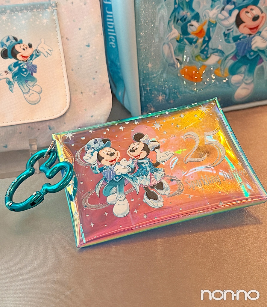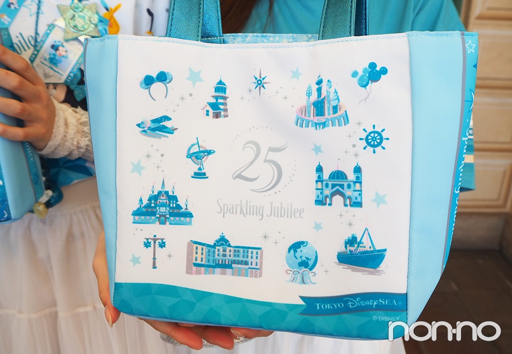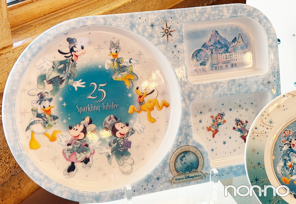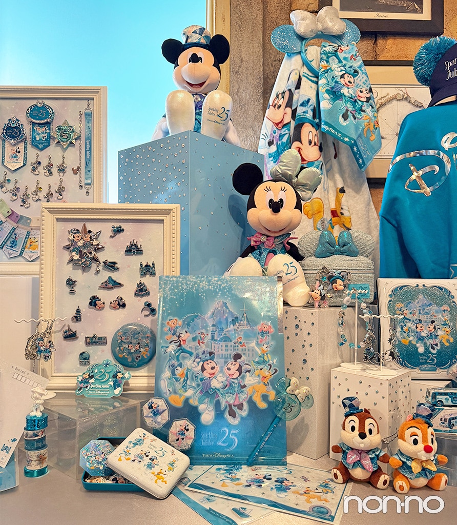 25周年のテーマカラーである、さまざまな海から着想を得た「ジュビリーブルー」に彩られたグッズが勢ぞろい。25周年のブルーの衣装に身を包んだミッキーハウスやミニーマウス、ドナルドダック、デイジーダック、グーフィー、プルート、チップ&デール、ダッフィーやシェリーメイをデザイン。バックにはプロメテウス火山やS.S.コロンビア号、ホテル・ミラコスタといった東京ディズニーシーを象徴するモチーフも描かれています。