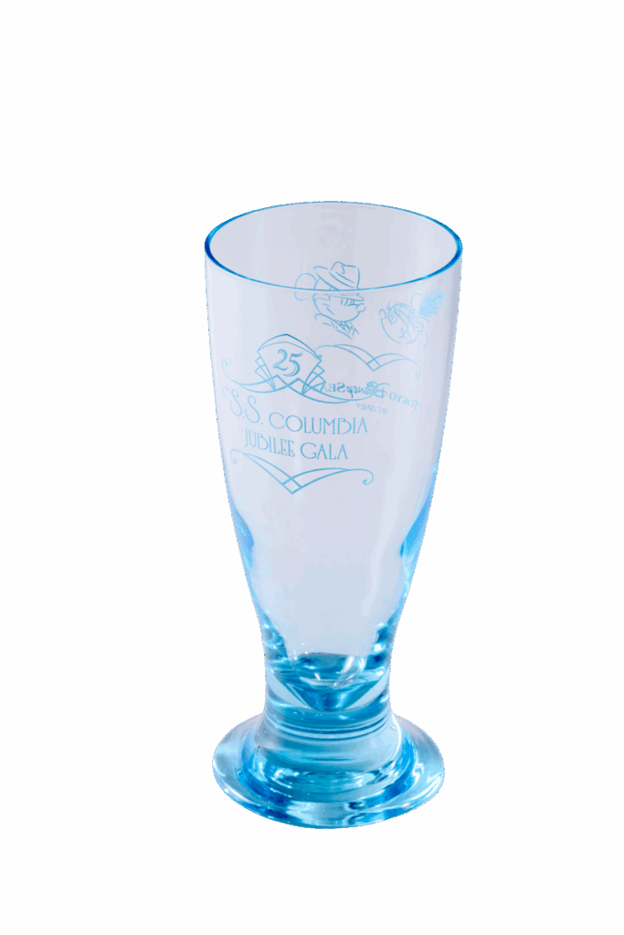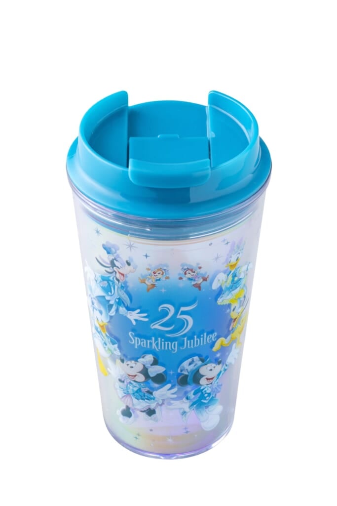 25周年をお祝いするミッキーマウスにミニーマウス、仲間たちやパークのモチーフのデザインがジュビリーブルーのグラデーションにマッチした、スーベニアカップ。ジュビリーブルーをイメージしたカップデザートとセットで注文することができる。