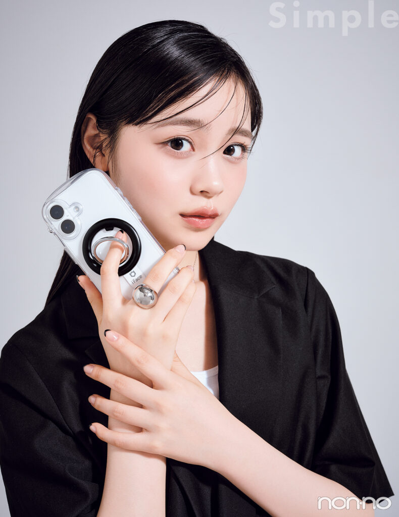 大ぶりのシルバーリングにブラックのフレンチネイル。カッコよさが際立つ手元には、クリアケースとブラックのスマホリングの無彩色でクールな組み合わせが似合う。コーデもモノトーンでまとめればモードな雰囲気に。