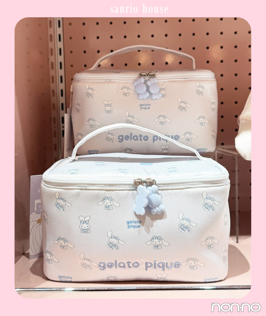 ジェラート ピケならでは、さらりとした質感のポーチも登場! ハローキティとシナモロールの2種で展開されるバニティポーチ。もこもこボーダーのルームウェアを着たハローキティとシナモロールがそれぞれ描かれています。ファスナーもキティのリボンだったり、キャンディ型だったりと細部にもきゅん! 内ポケットつきで整理しやすく、筆やペンシルを収納できる部分もあり、コスメポーチとしてデイリー使いから旅行まで幅広く活用できる。