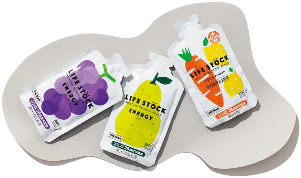手を汚さずに、サクッと小腹を満たせる飲むゼリー。グレープ味とペアー味はエネルギー補給に、レモン&キャロット味は食物繊維に特化。