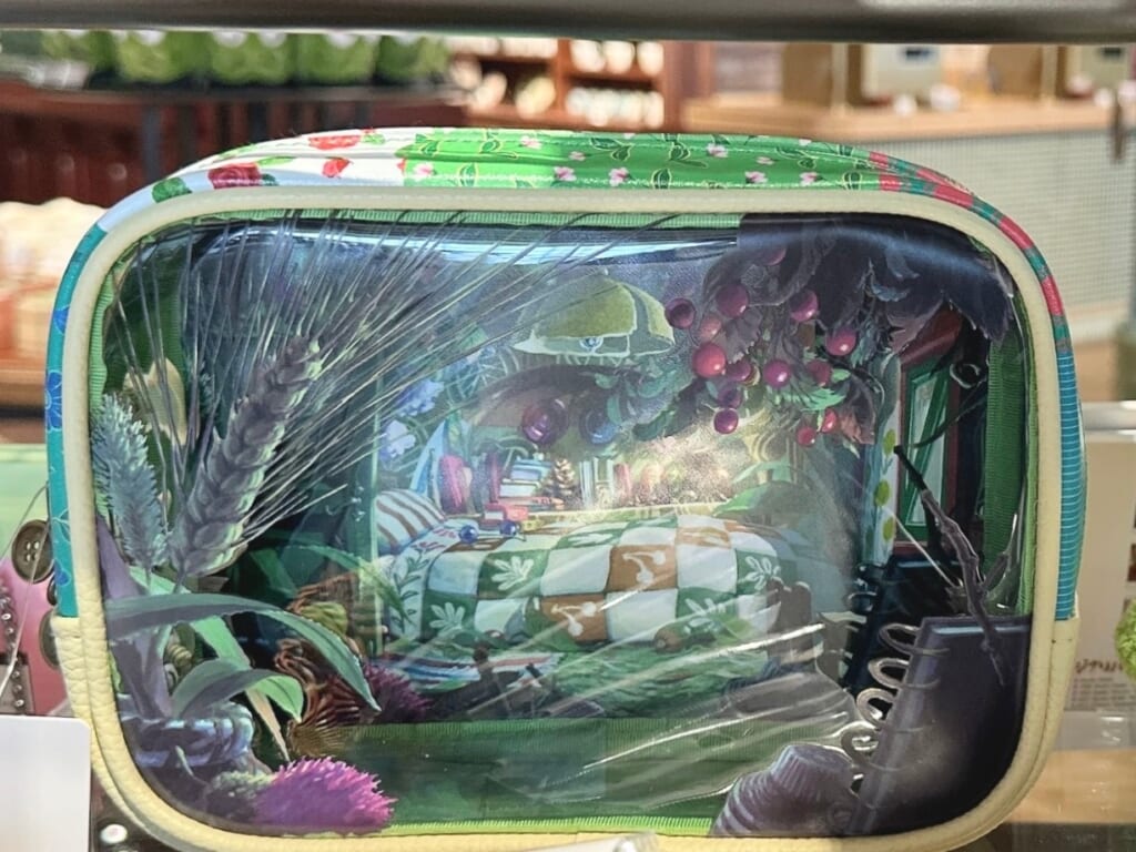 PVCクリア素材で中身が見えるスクエアポーチ。前面に植物を、背面にアリエッティのベッドルームのようすをプリントし、まるで草葉の陰からアリエッティのお部屋をのぞき見しているような、奥行きのある立体的なデザインが見事です。マチ部分にはアリエッティのお部屋を彩る壁紙の柄があしらわれています。中に推しキャラのフィギュアやぬいぐるみなどを入れてディスプレイ用に使う猛者もいらっしゃるとか……。