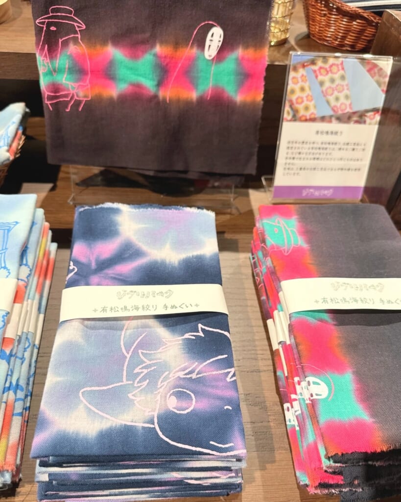 東海道の宿場町・茶屋街として栄えた愛知県名古屋市の有松・鳴海地区で、江戸時代から作られている伝統工芸・有松鳴海絞りの手ぬぐい。布をくくって染める“絞り技法”により描き出された美しくも幻想的な紋様のなかに、カオナシ・インコマン・ポニョといったジブリキャラクターが浮かびあがります。