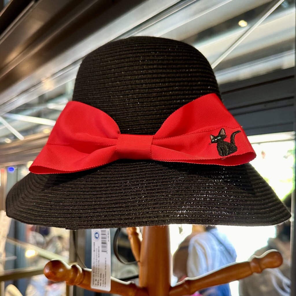 「カチューシャ着用にははちょっと抵抗がある……」とさまざまな理由から躊躇する大人世代のみなさまのパーク内着用ヘッドギアとしておすすめなのが、折りたたみブレードハット。写真(↑)の黒地×赤いリボン(キキ風デザイン。端にジジの刺しゅう入り)をあしらったデザインのほか、ベージュ地×ボルドーカラーのリボン(ソフィー風デザイン)、グレー地×黒のリボンの3タイプがあり、いずれもくるくるコンパクトに丸めてバッグに収納できるので持ち運びに便利。「ジブリの大倉庫」以外の4エリアは「魔女の谷」を含めてすべて屋外にあるので、園内を探索する際や行列待機時の日焼け防止対策が欠かせません。ストロー素材で通気性がよく、深めにかぶれてつばも広いので、紫外線対策に効果的! どんなコーディネートにも合わせやすそうなので、普段づかいも視野に入れ、ぜひ活用してみてください。