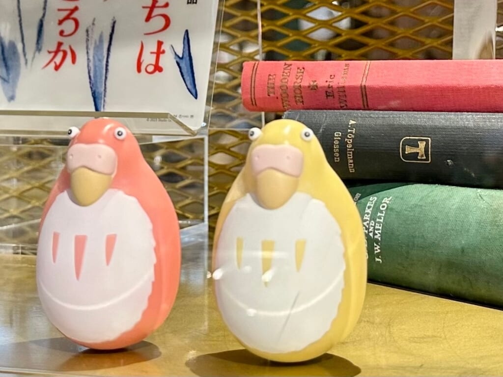 同じく『君たちはどう生きるか』関連グッズで見逃せないのが、ユーモラスな存在感たっぷりのインコマン型おきあがりこぼし。2体セットです。傾けると、ゆらんゆらんと独特な動きをみせるので地味に楽しいです。青・緑セットもあります。