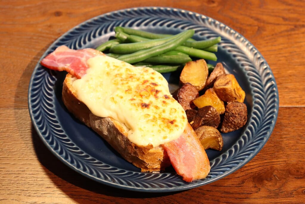 土・日・祝日限定で、9時半から10時半の間にオーダーできる朝食メニューが大人気! 2025年5月10日(土)から、新メニューのクロックムッシュ(¥1300)が仲間入りしました。フランスで親しまれているブランチの定番料理で、パンから豪快にはみ出した厚切りベーコンが食欲をそそります。