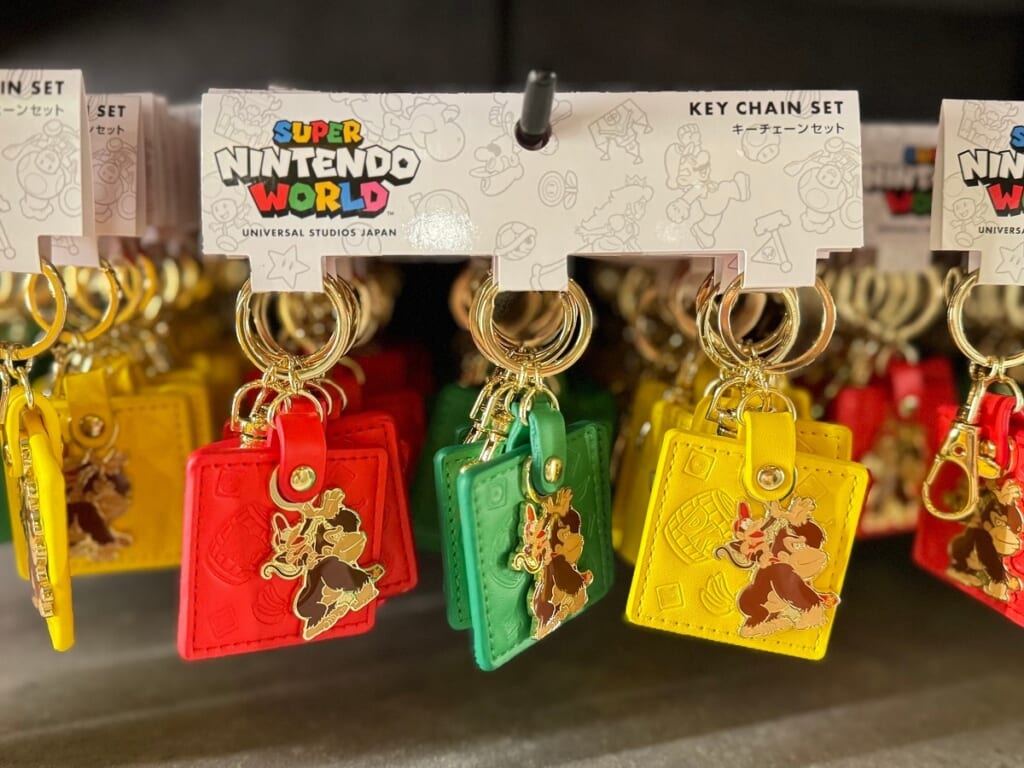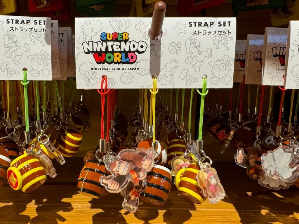 ストライプの色が異なるタル大砲に、ドンキーコング、ディディーコング、ディクシーコングのアクリルキーホルダーがついています。3つセットなので、友達とシェアしておそろいに◎。