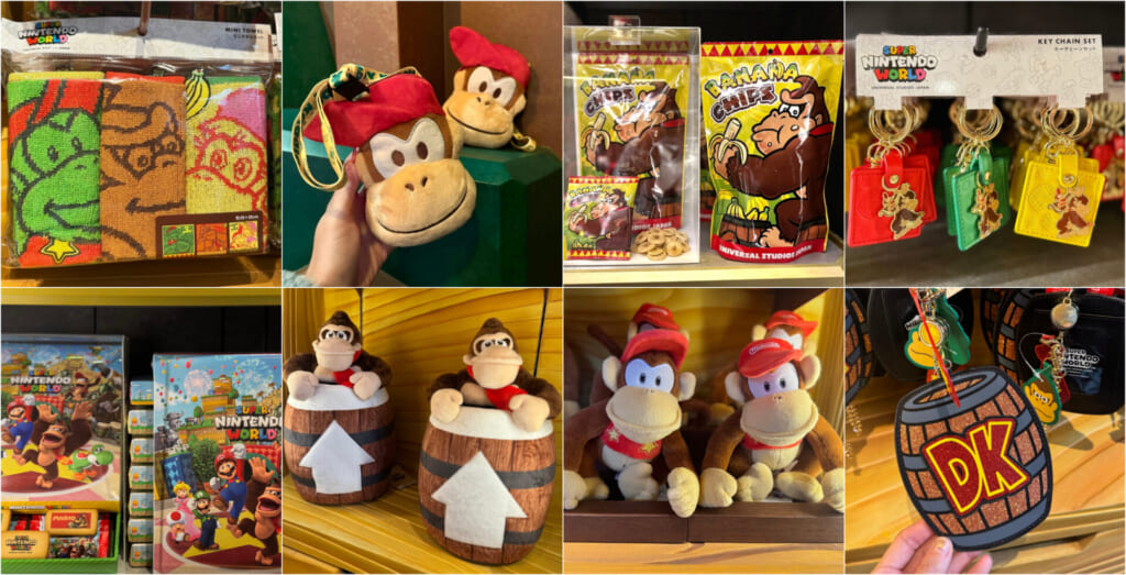 ドンキーコングのグッズは、新エリア「ドンキーコング・カントリー」内のショップ「ファンキーコングのフライ・アンド・バイ」のほか、一部ショップで展開されています。お土産にぴったりのお菓子類や、カチューシャなどのかぶりものは、パークに入ってすぐの大きな店舗などでも多くラインアップ。新エリアに入場できなくとも、一部のグッズは購入のチャンスがあります!