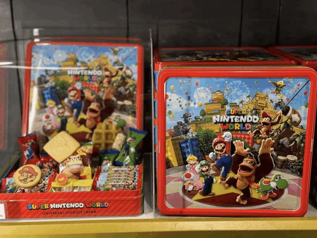 ドンキーコングやマリオなどがプリントされたクッキーなどが入ったお菓子のアソート。中身をしっかり味わったら、缶は収納ボックスとして活用したい!