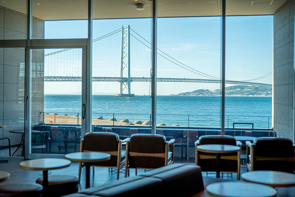 ドライブスルー利用もできる「神戸西舞子店」。店内2階からは、明石海峡大橋を望むダイナミックな瀬戸内海ビューが! テラス席もあり、リラクシングな時間を過ごせます。