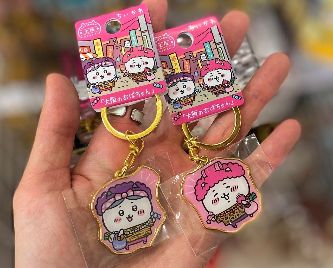 ハチワレとちいかわが大阪のおばちゃんに変身! 「大阪のおばちゃん」デザインはとても人気で、“どこなら売ってるの!?”と品薄な状態が続く少々レアな商品なんです。派手な髪にアニマル柄の服、買物袋から飛び出た野菜、片手にあめちゃん……芸が細かい!