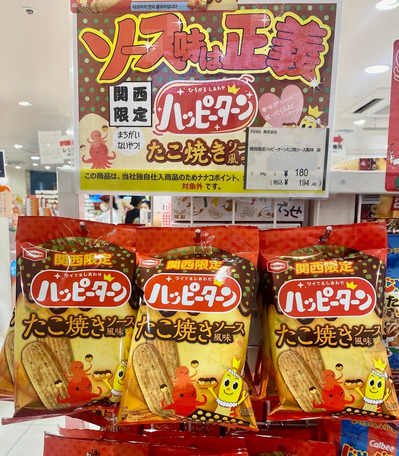 関西限定のハッピーターン。香ばしいソースと青のりがガツンと効いた濃いめ味です。食べ切りサイズは、“まだもう少し食べたい!”と余韻を残すような絶妙なボリューム感。他エリアの地域限定商品も食べてみたくなるハズ♪