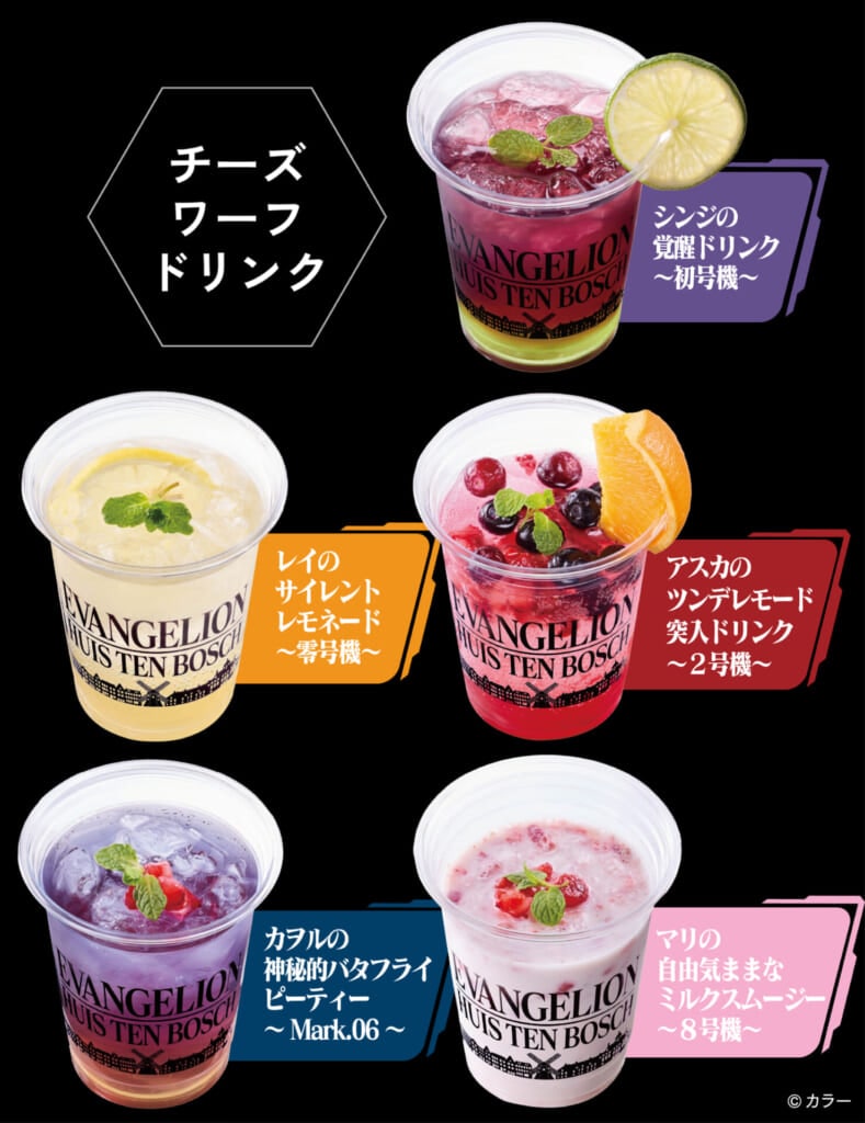 ハウステンボスのチーズ料理を扱うお店「チーズワーフ」では、「シンジ」「レイ」「アスカ」「カオル」「マリ」をイメージしたグルメやドリンクが登場! 『エヴァンゲリオン』の作品内で登場する“あの”フレーズをメニュー名に取り入れています。注文する時も楽しそう!