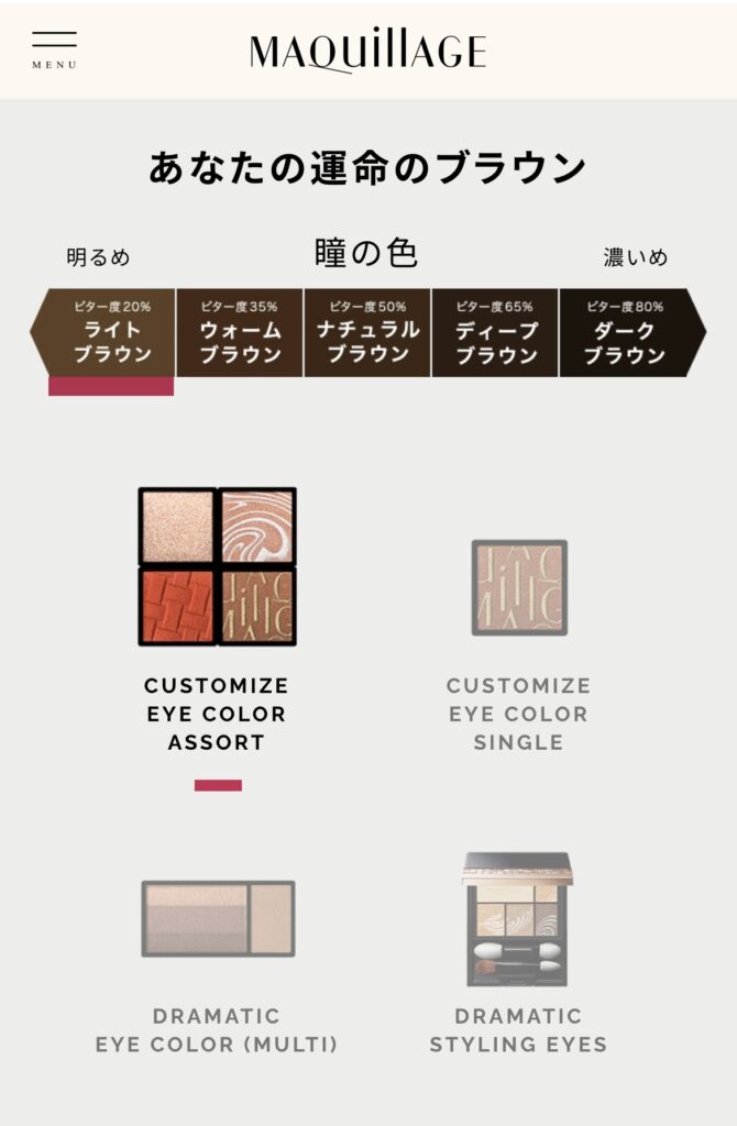 でも瞳の色と合わせるの難しいな〜と思った方……実は、マキアージュの公式サイトで、『運命のブラウン診断』が簡単にできちゃうんです!! 私もやってみたら、「ビター度20% ライトブラウン」と結果が出ました!