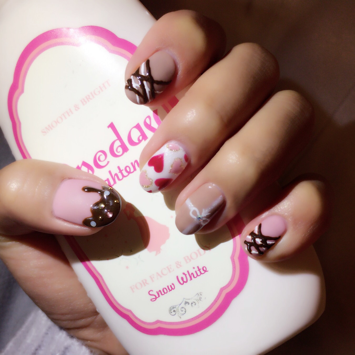 この前のバレンタインの時には自分でデザインを考えてこんな感じのバレンタインネイルをしました( ´-` ).。oO ( ♡ )