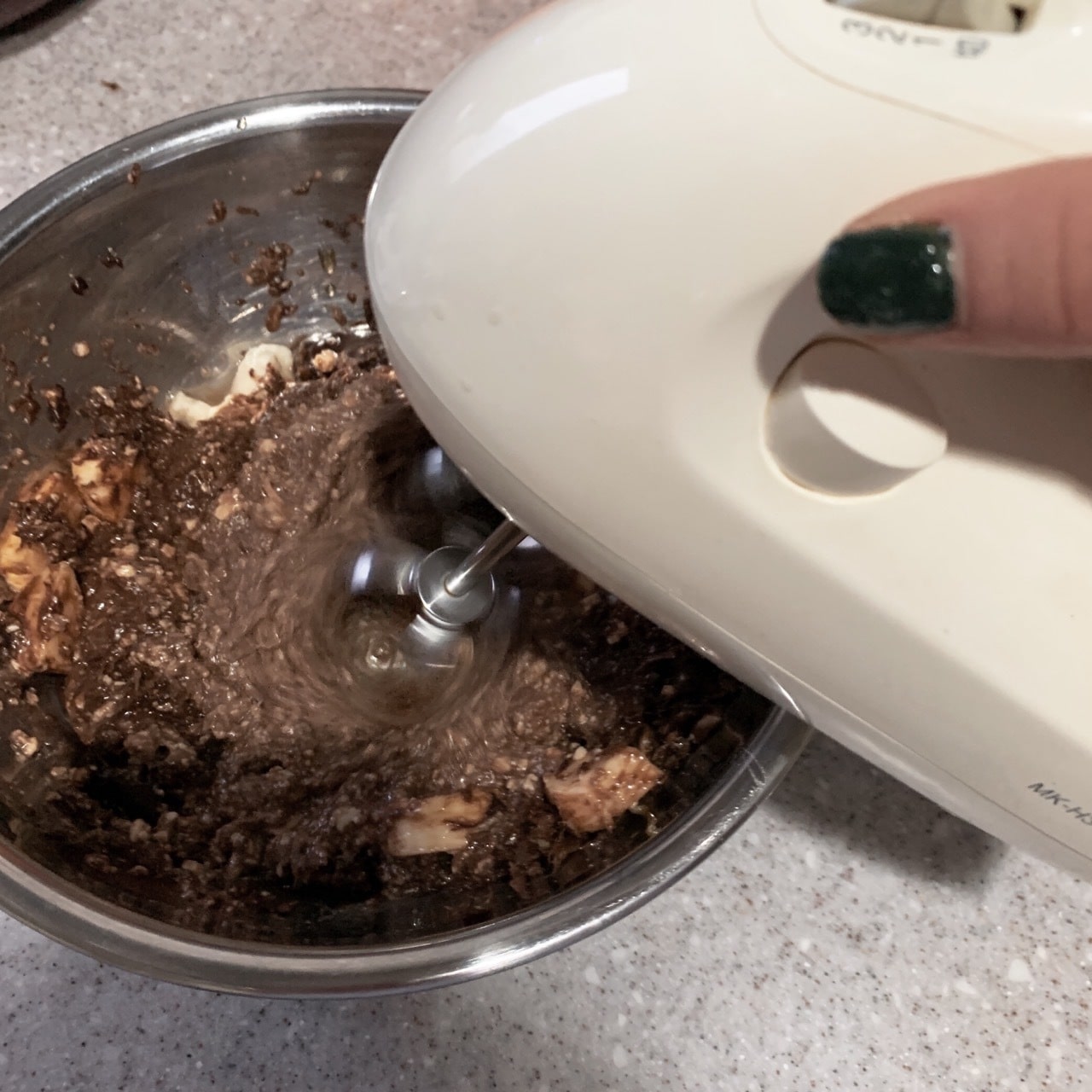 4ボウルに、水切りした豆腐・卵・2のバナナ・3のごぼう・砂糖を入れてハンドミキサーで混ぜる