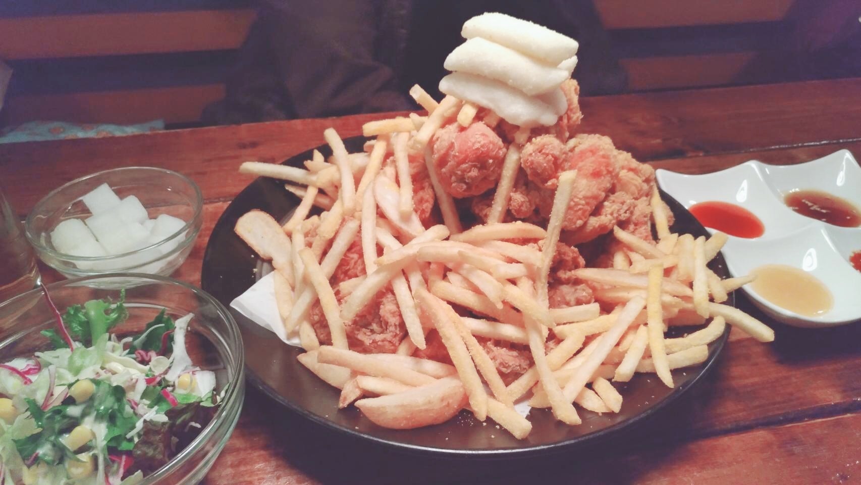 ポテトと揚げたトッポキがついていてチキンもボリュームが凄いっ!!?