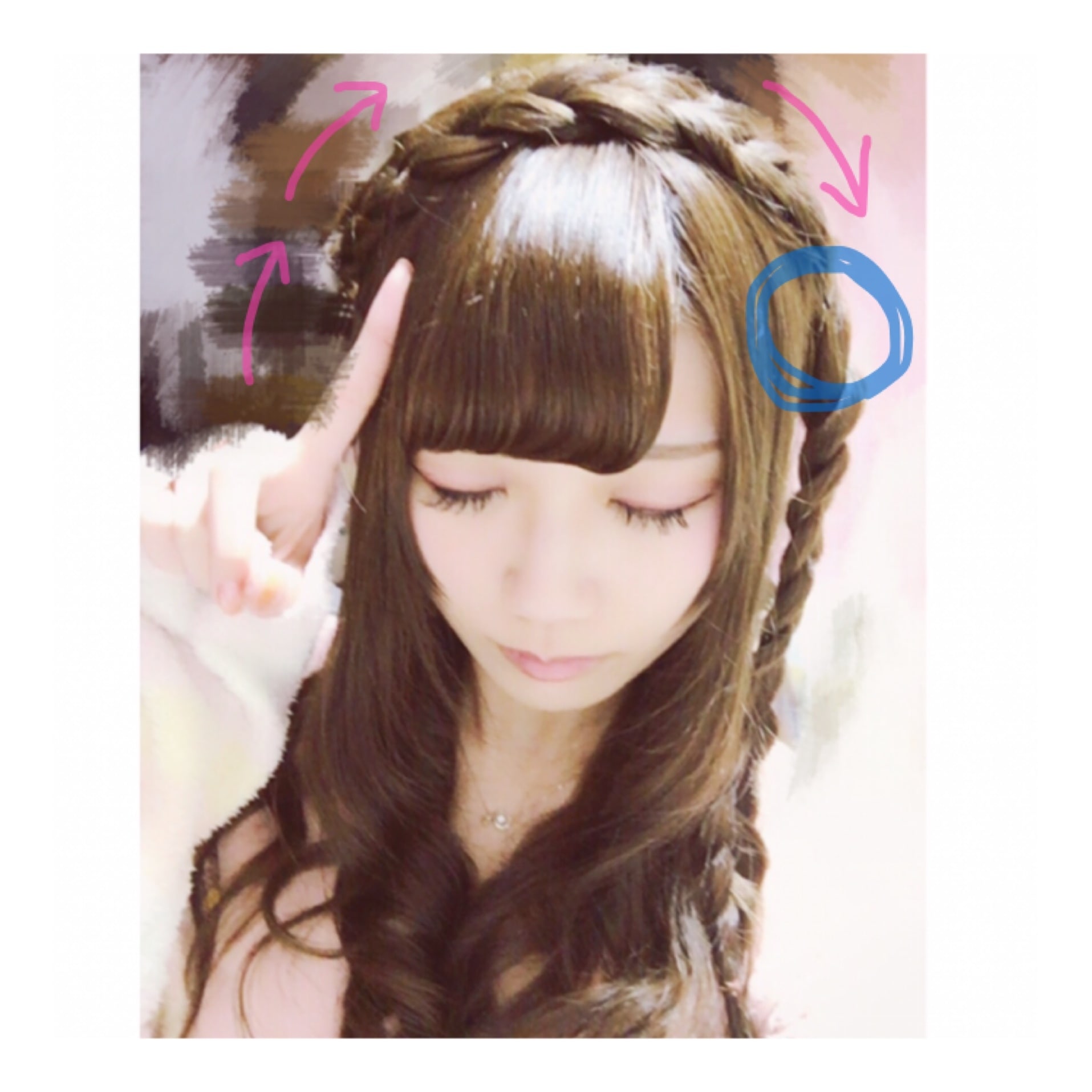 ①左右どちらかから1本の三つ編みを作ったあとにピンクの矢印のように頭上からぐるんと反対側に。ピンで仮止めしておくのがおすすめ。