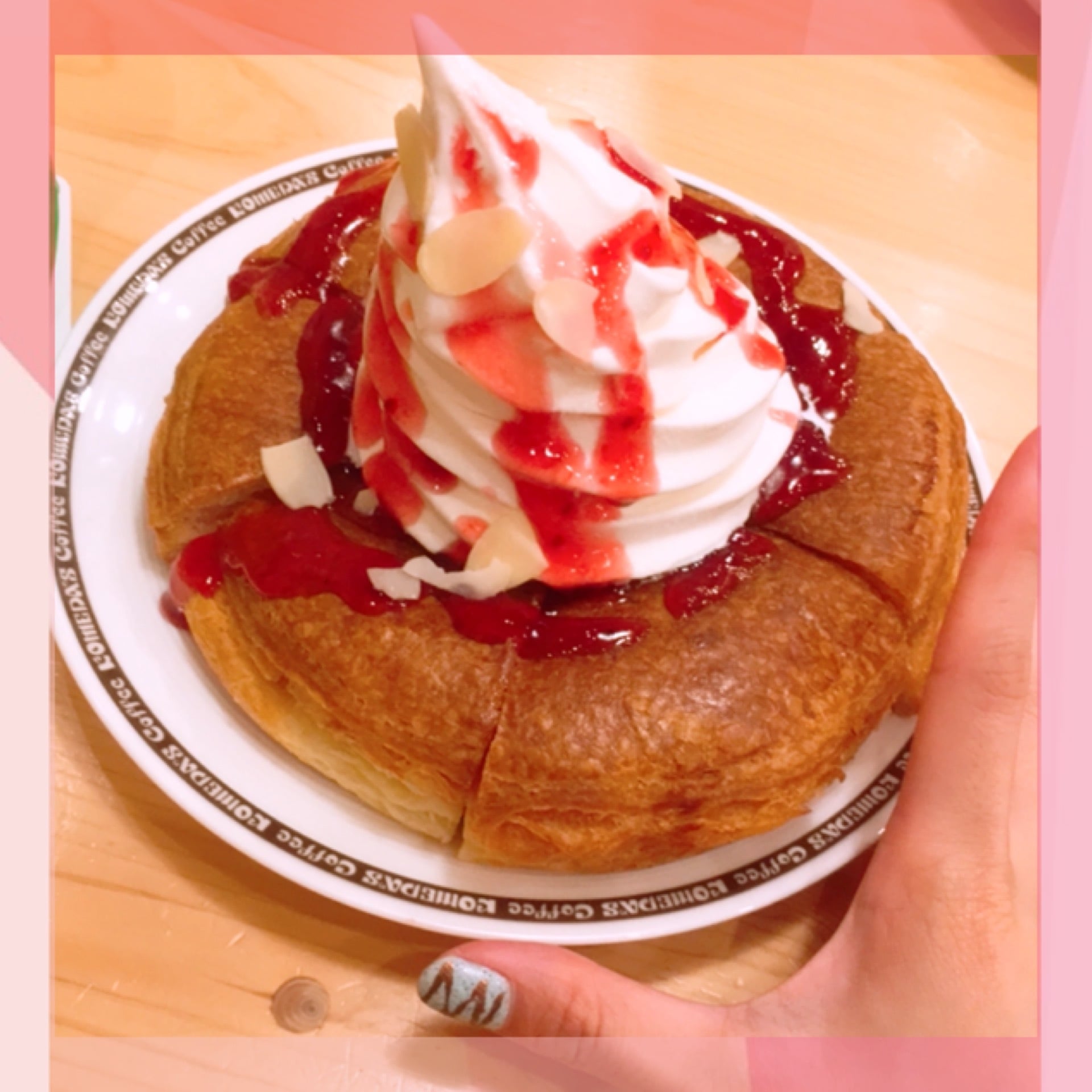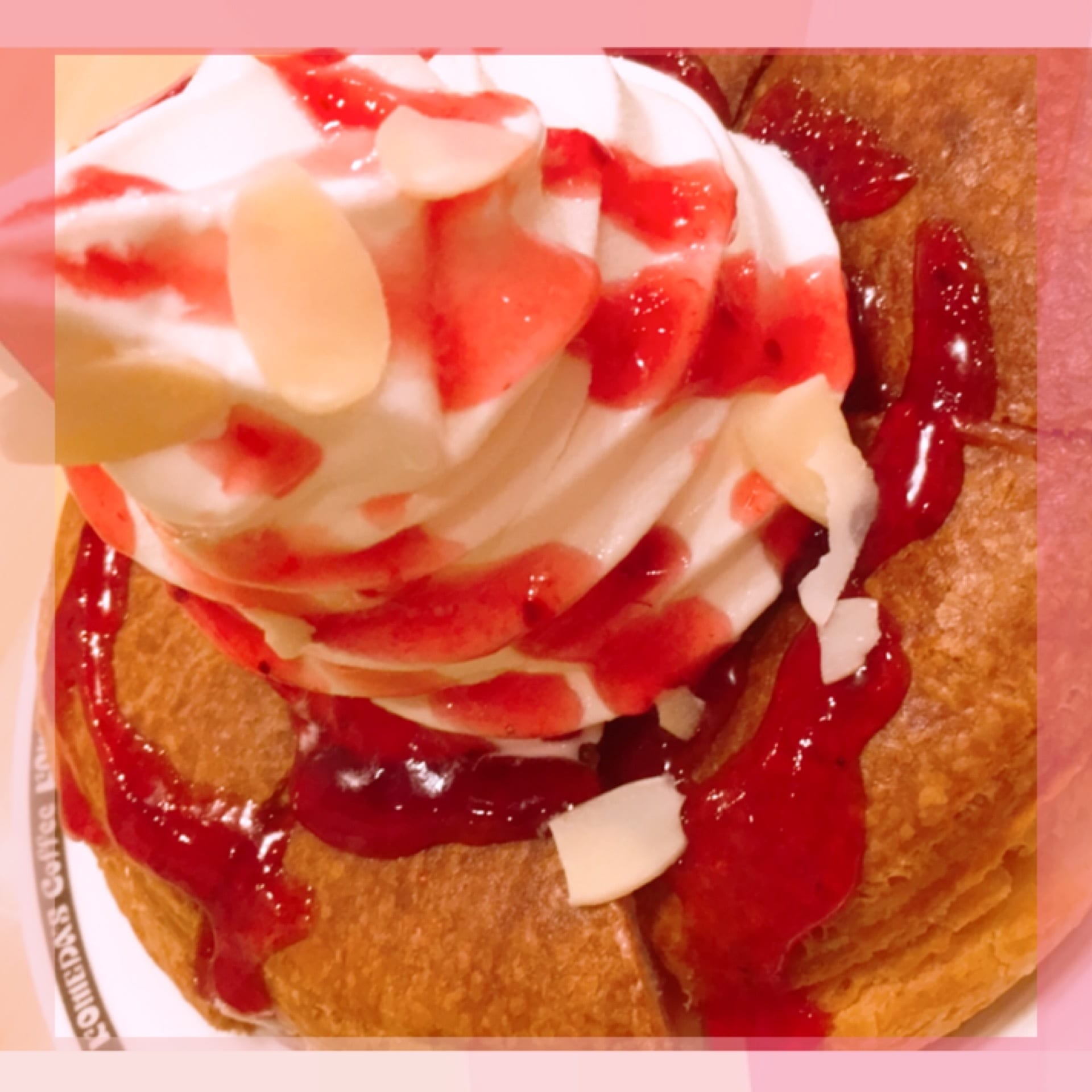 桃香るクリームとラズベリーソースとアーモンドのスライスが乗っている特別仕様でカワイイです♩