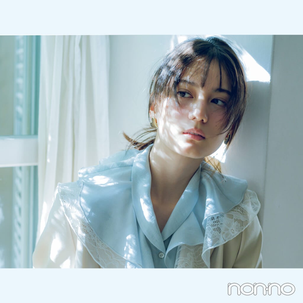 日向坂46小坂菜緒の春ジャケットコーデ。フリル衿ブラウスを重ねてチャーミングに