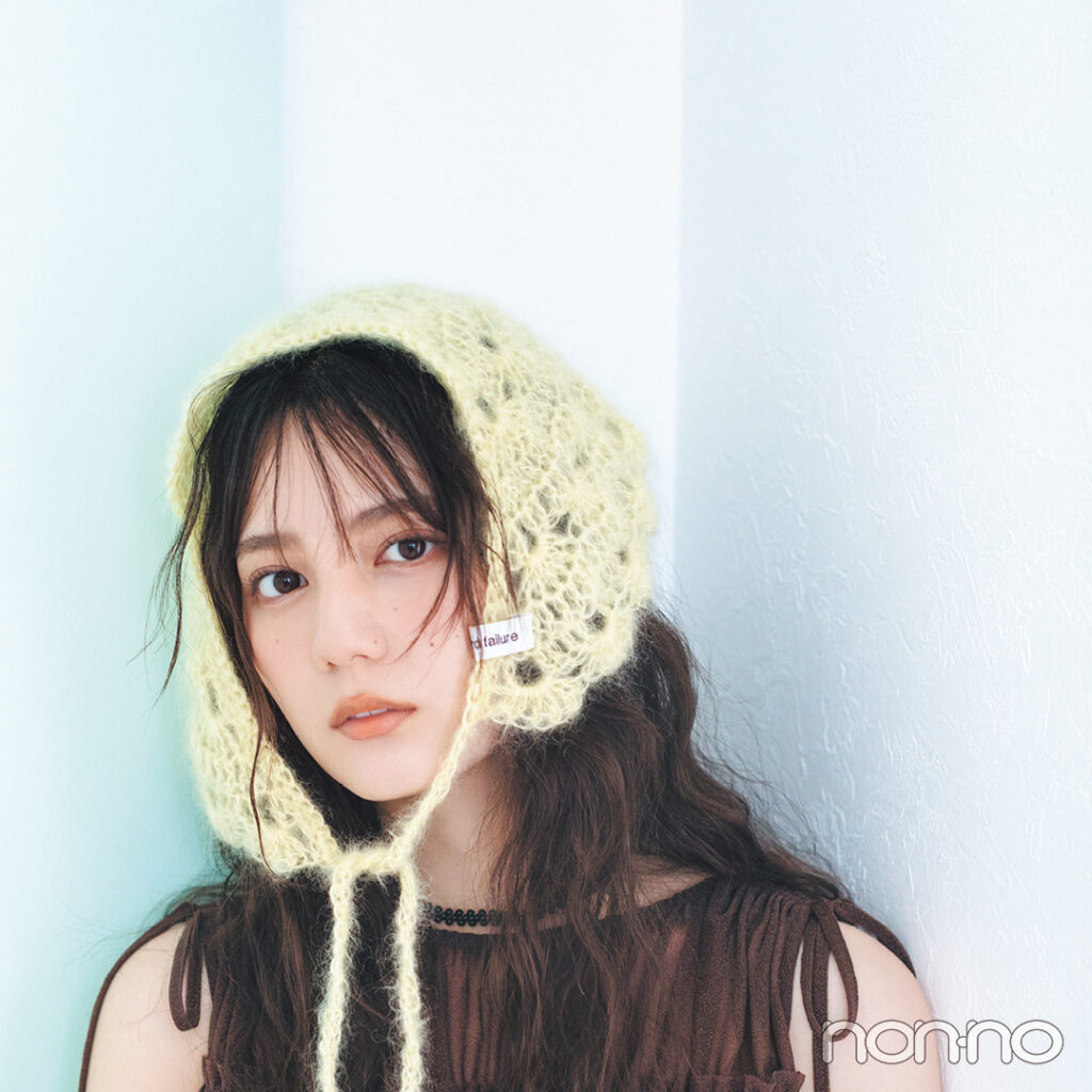 日向坂46小坂菜緒×ニットバブーシュカ。シアートップスにぬくもり素材を合わせて秋を先取り
