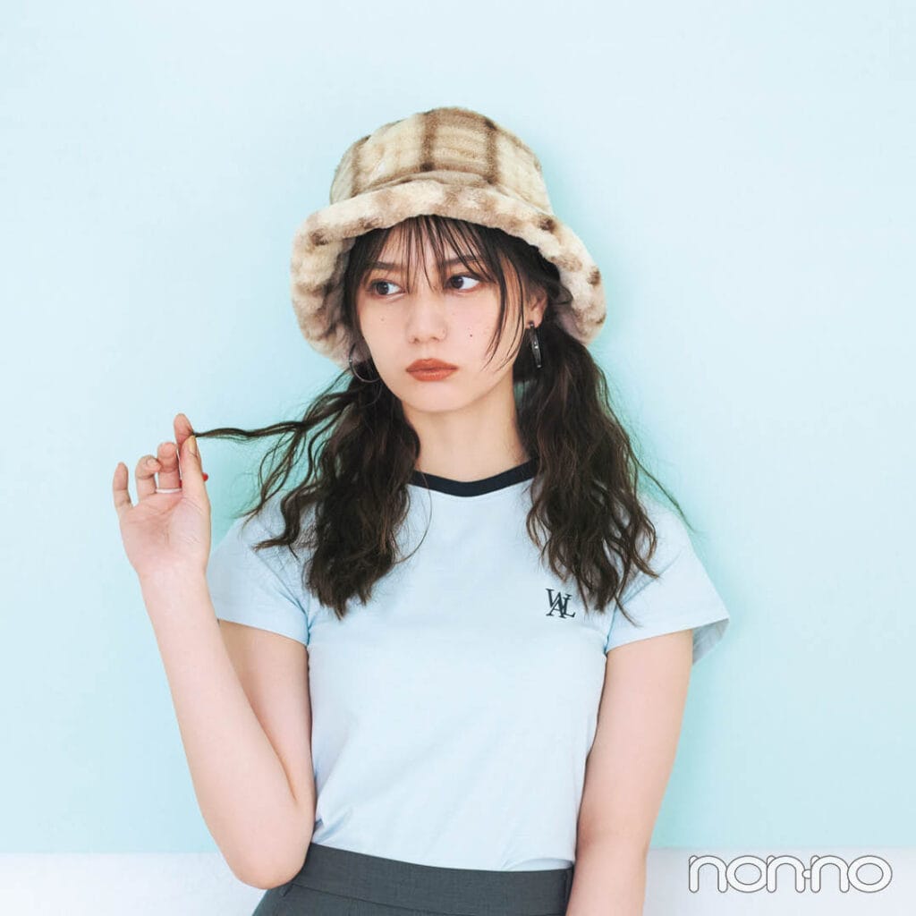 日向坂46小坂菜緒×フェイクファーバケットハット。リンガーTシャツに合わせて90年代風ムード