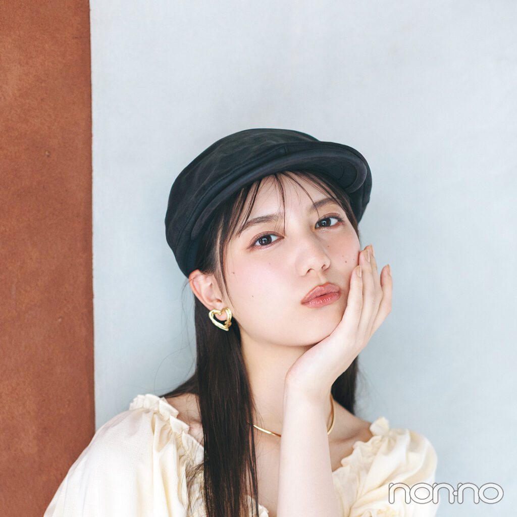 日向坂46小坂菜緒×レザーハンチング。ガーリートップスに合わせて糖度控えめに