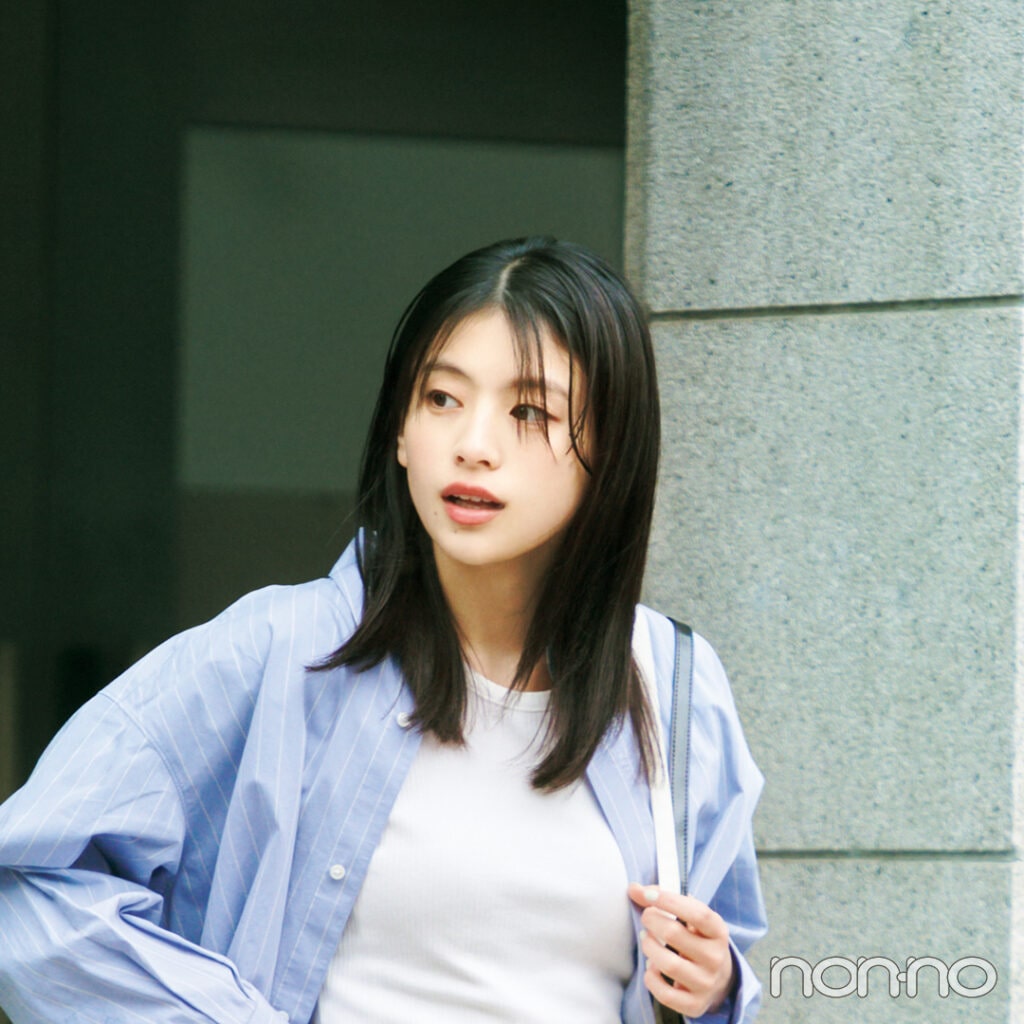 出口夏希が大学生だったら?ブルーストライプシャツをはおってスマートに