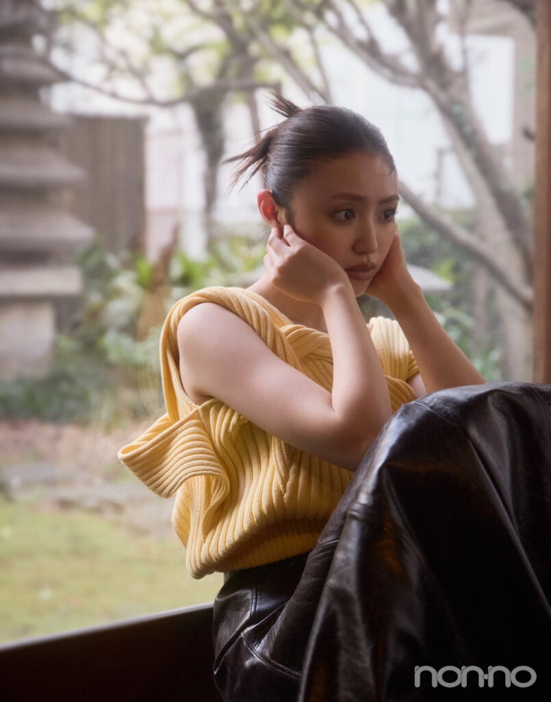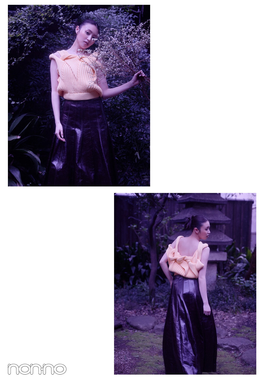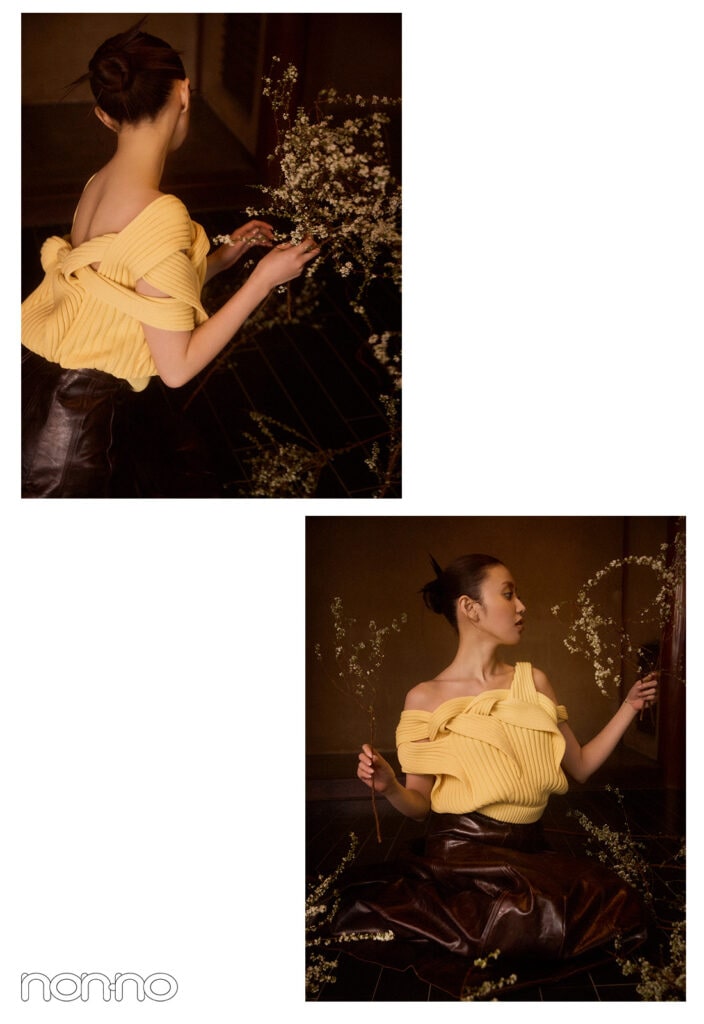 好きなお花不動の一位はダリアだったけど、今日でユキヤナギに塗り替わったかも! ダイナミックな枝と小ぶりなお花のギャップが粋でいいなって。撮影前はカスミソウに似ているのかな?と思っていたけど、まったくの別物。ダリアのようなゴージャスな花姿とはまた違って、一枝で凛とした美しさを放つ。それぞれ自由に伸びた枝ぶりも個性的ですごく素敵。花瓶やブーケの中にいても完全脇役ではなくて、名バイプレイヤー的な存在感って言ったらいいのかな?(笑) ノンノの可愛らしいイメージとは一線を画す、おしゃれで研ぎ澄まされたモードな衣装やメイクにもドキドキしました♡