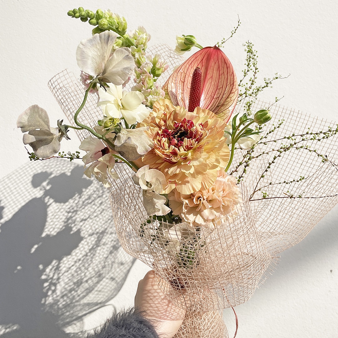 神宮前の裏路地にひっそりと佇むフラワーショップ。グレーやベージュの色みが加わったくすみカラーのお花を多くそろえる。形状の異なる花材を束ねることにこだわり、大輪のお花には、長さのある葉や実ものを合わせてリズムのあるアレンジメントに。おしゃれなカラーでつくる落ち着いた雰囲気の花束は、大人の女性に贈るのにぴったり。