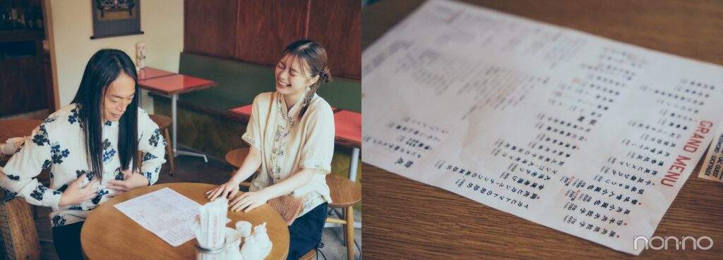 紺野 じゃあ、ガッツリ頼みましょう! 私は胡麻きゅうり(¥495)と干豆腐サラダ(¥825)、あと名物の豚肉焼餃子(¥660)は絶対に頼みたいです!