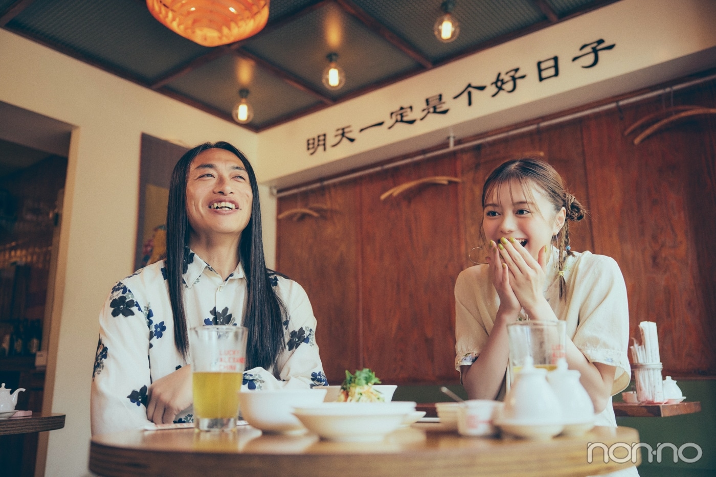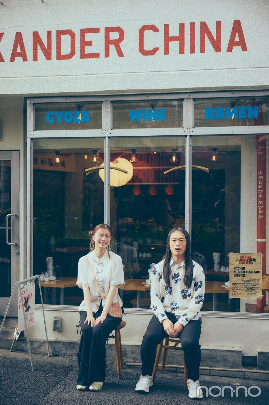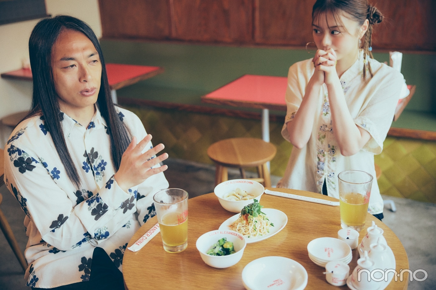 紺野 ラブさんが来てくださることになったと聞いて、“占い=中華系”がいいかなと思い、Instagramで大捜索しました! そこでこの『LUCKY ALEXSANDER CHINA』さんを見つけて、“こんなぴったりなお店はない♡”ということで、ここで撮影させていただくことになりました! LUCKYと店名にあるとおりお皿の底には「幸運」の文字があったり、中国で縁起が良いとされる“8”にちなんだ8角形のテーブルなど、縁起の良いとされる設えやモチーフが散りばめられているそうです。